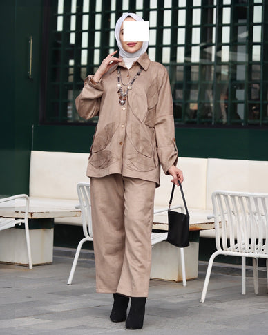 طقم من الشامواه الناعم، مُصمم بتفاصيل أوراق منقوشة لإطلالة راقية ومميزة. يتميز القميص بأزرار وقصة مريحة تضمن لك الراحة طوال اليوم. يُكمل البنطال المستقيم الإطلالة بلمسة نهائية أنيقة وبسيطة. يُضفي اللون الرمادي الداكن دفئًا وأناقة يومية، مثاليًا للنزهات البسيطة أو الإطلالة الكاجوال الأنيقة.