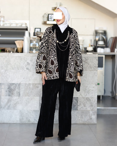 مجموعة من المخمل المكرر تتكون من 3 قطع مصممة للمناسبات الراقية والأمسيات الأنيقة. تحتوي هذه المجموعة على سترة مخملية مطرزة مصممة خصيصًا فوق بلوزة داخلية متطابقة وسروال بقصة مستقيمة. تضيف التطريز الفضي المعقد عمقًا وتباينًا للمخمل الأسود الغني، مما يخلق مظهرًا قويًا ولكنه رشيق يوازن بين الهيكل والمرونة.
